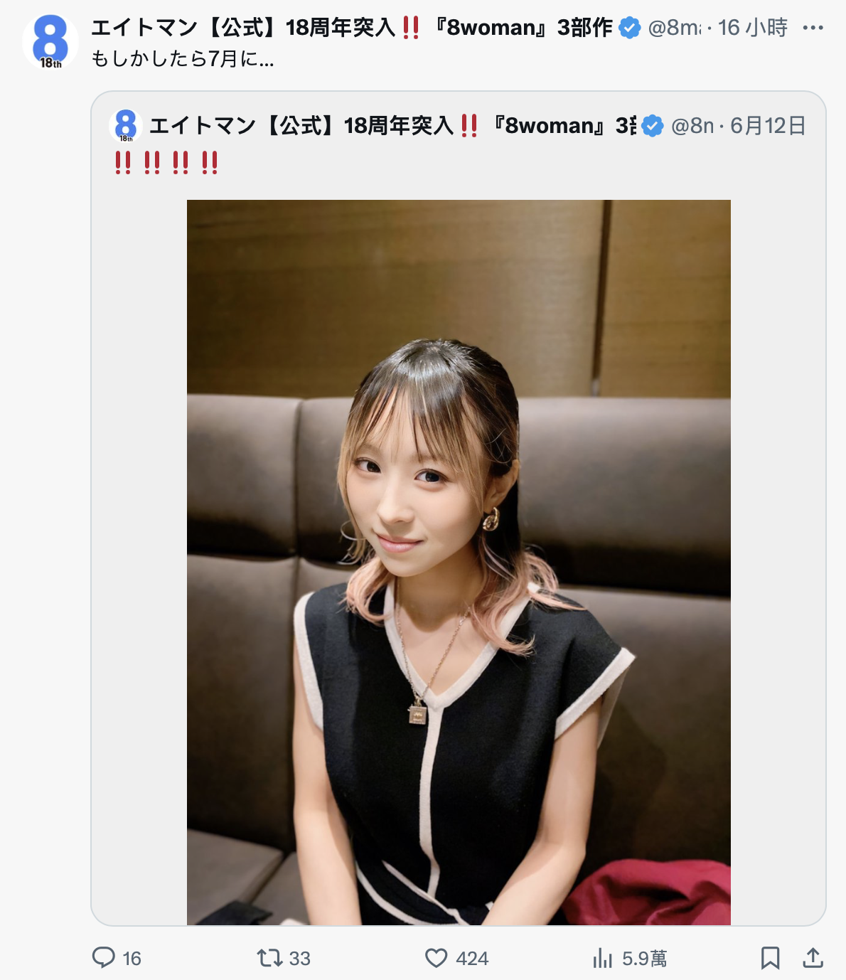 大家还记得吗?前一阵子这家经纪公司才在自己的官方X(https://x.com/8manpro)公布「星まりあ(星麻里亚)」的近照,后来还转推加了一句「也许在七月」让人期待这位好久不见巨乳小只马可以重回战场,结果想不到今天再看,那篇发文不见了⋯