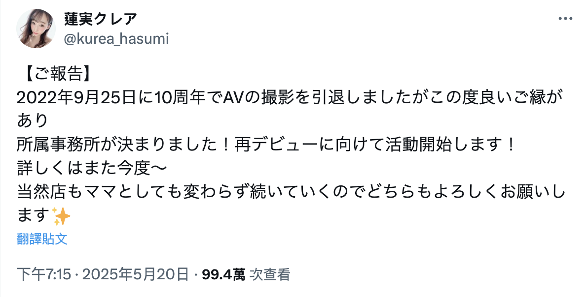 著名的发片机器、也是骑乘位女王的「莲実クレア(莲实克蕾儿)」昨晚在X(https://x.com/kurea_hasumi)发文,说自己已经做好准备,要回归拍片惹~