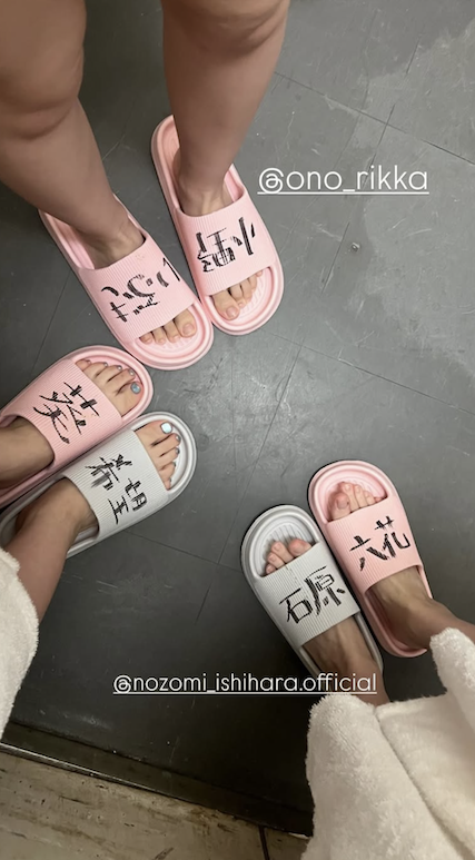 因为如果是2-3位女优的共演,那用颜色来分鞋子就好了,为什么标名一定是摄影棚有很多女优走来走去,要避免有人穿错造成不适所以就会在浴袍和鞋子贴上女优的名字ー现在活动的消息很好找,你没有看到小野六花、石原希望和葵いぶき(葵伊吹)一起出席活动的消息,那就是她们一起啪啪啪惹〜