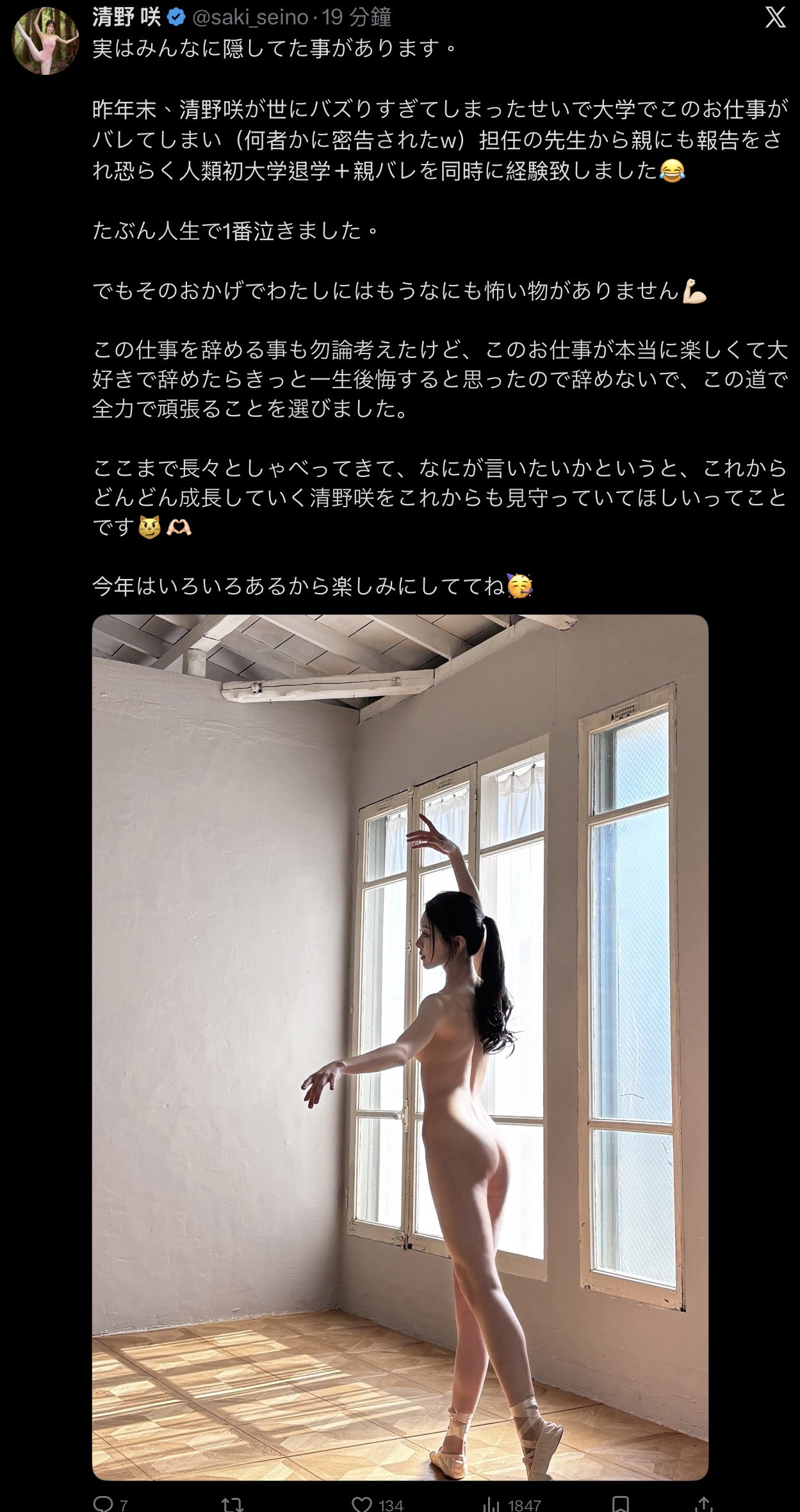 还是大学生的她被密告了,导师随后将她成为AV女优的事回报给家长,最后让清野咲同时经历了「大学退学」以及「父母抓到」的双重打击,这位片商口中的芭蕾天才说自己在那段时间掉了这辈子最多的眼泪,很苦,真的很苦~